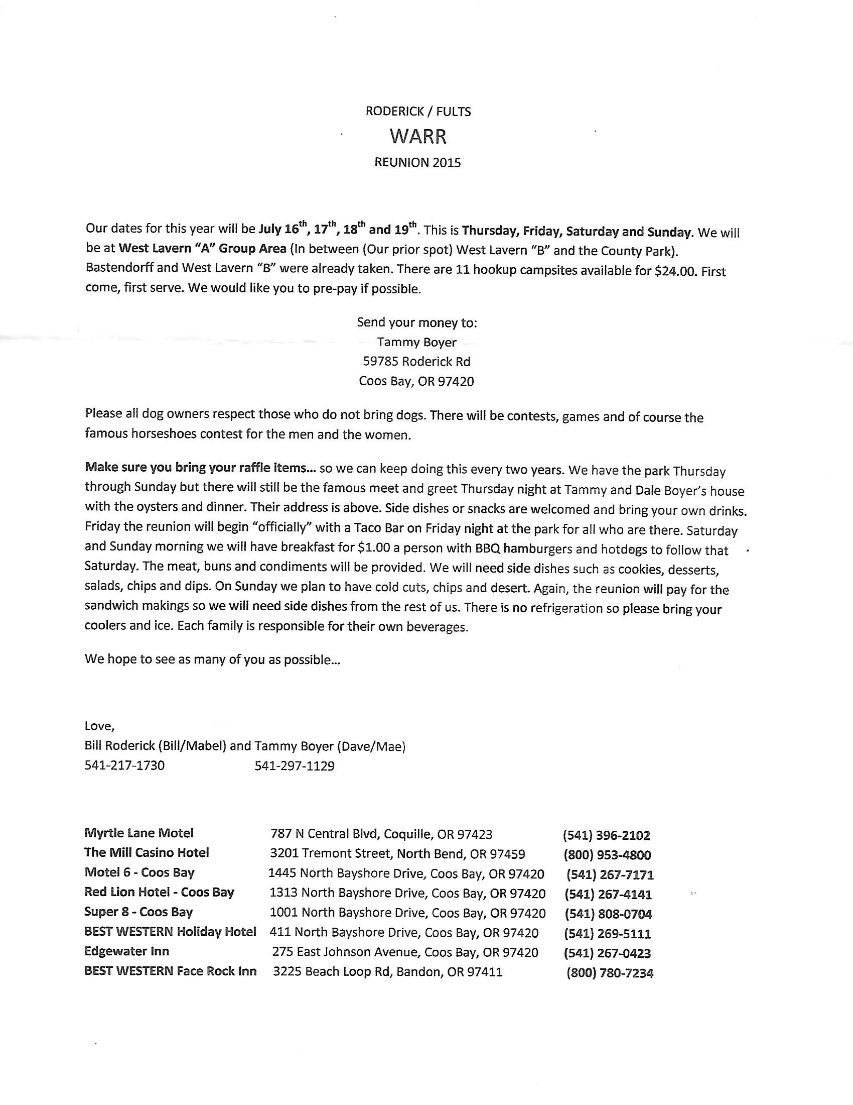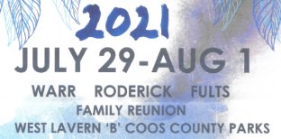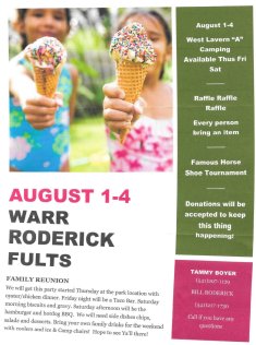 WARR/RODERICK/FULTZ FAMILY REUNION is set for JULY 16 through 19, 2015...