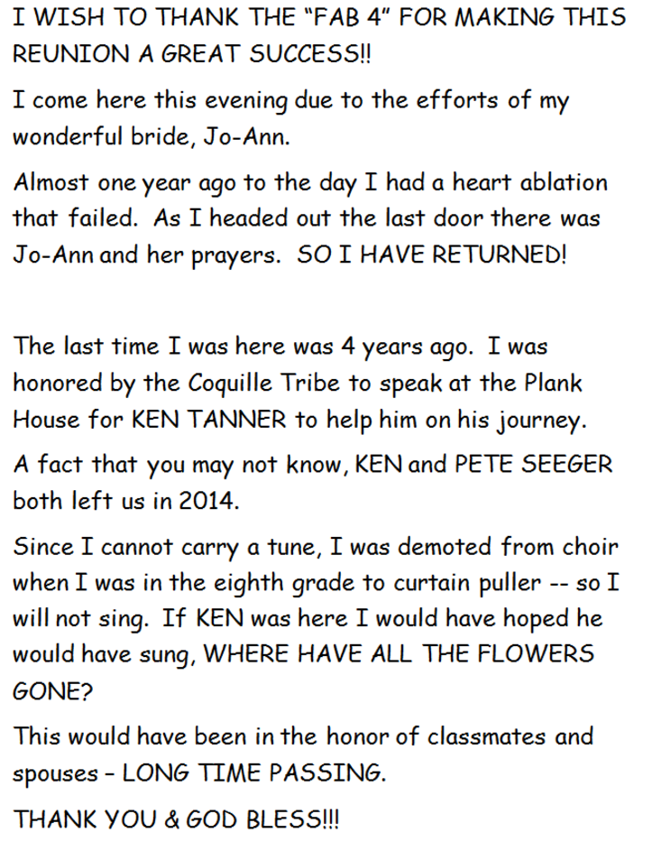 8/31/2018 Just a thought. How about having our 80th birthday party in May on weekdays? Could a lower room rate be negotiated? Airline flights and rent cars would be cheaper. More interesting, we could meet in assembly with the graduating seniors. Educational break for the kids that administrators would welcome, and fun for us. And publicity. The World and TV would love it! What do you think? ---------------------------- 8/20/ 2018 Dear Steve, You are amazing! I think the website is every bit as good as the party itself. I have heard that there are several of our classmates that have viewed it daily since last weekend. I will be sending out a follow-up with the website on it again. What a great contribution you made to our class. I will always look at numbers differently after hearing you talk! Great getting to know you better was a very positive part of our party! Thank your wife for being so patient with all of us. We get into the chatty, what have you been doing mode and it must be hard for spouses. Think that is why my husband prefers to make these types of events fishing expeditions rather than coming with me. As ever, Dona -- Dona Foote ---------------------------- Thanks Dona, That really means a lot to me. Tell your husband I'll be looking forward to meeting him-- Steve Warr. 8/13/18 Even though I was not able to attend, Steve, I enjoyed looking through the "annals of time" -- Ann Felkner 8/13/18 Will this website be a place where people can write in with any future words, adventures,etc...? Kay Holman Yes 8/13/18 This webpage is very special! -- Tom Jenkins |
