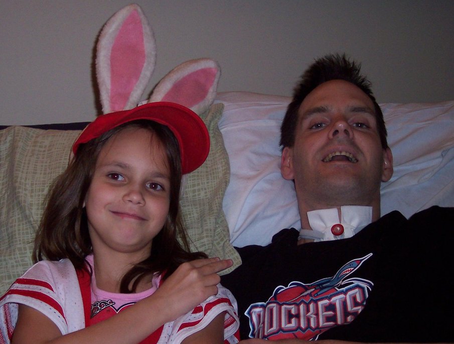 Ken is with us again today, but he is scheduled to go to TIRR again Wednesday so we will have to visit him there for a couple of weeks.Tuesday March 17 Ken will not go to TIRR tomorrow or maybe even a few days more. They have to wait until there is a vacancy and there seems to be some sort of problem with insurance. His spasms are raging today.Wednesday March 18 Still no word on TIRR. Ken stayed in bed all day today -- not feeling well. After I got home, he got up for dinner and the Rockets. Go to The beginning Go to new entry Sunday March 22